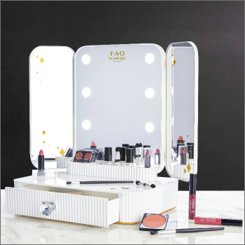 Ce coffret complet comprend 24 pièces pour imaginer et créer des looks uniques. Fond de teint, primer, blush, rouges à lèvres, vernis à ongles, pinceaux… tout est là, accompagné d’un miroir vanity illuminé à trois volets pour un effet lumineux et glamour. Une simple pression sur le bouton situé à l’arrière allume ou éteint la lumière pour économiser l’énergie des piles (non incluses).